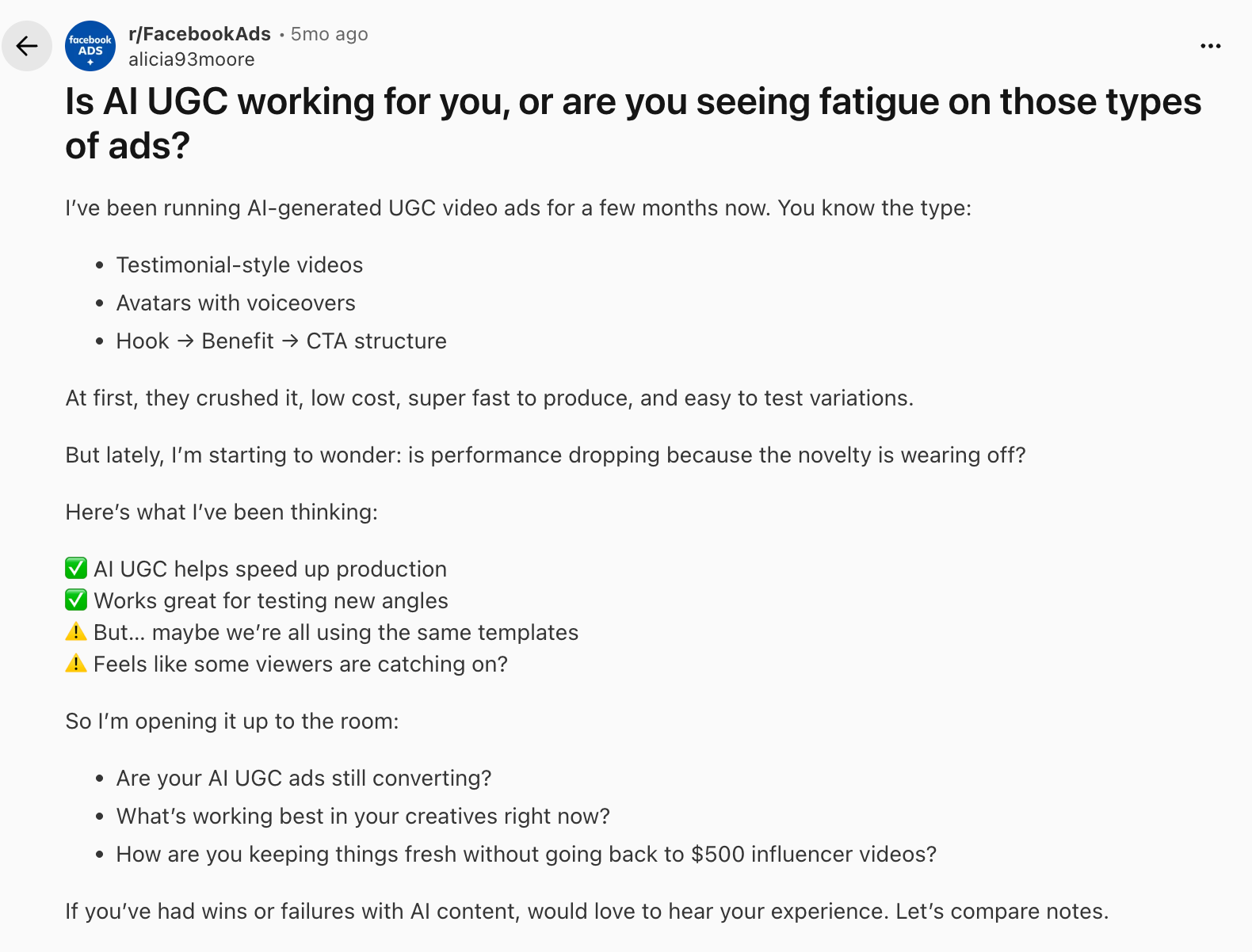 Instead of asking, "Hey, why are my AI UGC ads not that effective anymore?"
