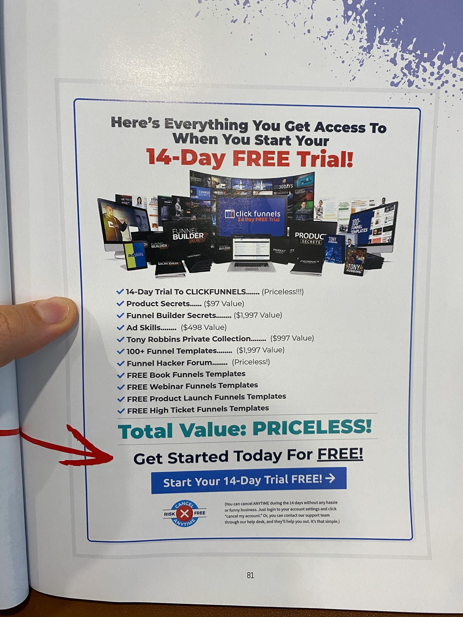 In Russell Brunson's case (he sells a funnel software) – it is get a bunch of courses, books & templates FREE! Just start a 14-day trial on our software, which becomes $297/month after that.