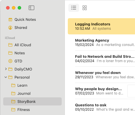 You don't have to complicate this. When I come across something interesting or inspiring, I pull out my iPhone and write notes. These go into a folder called "StoryBank" – although I use a bunch of other folders as well.