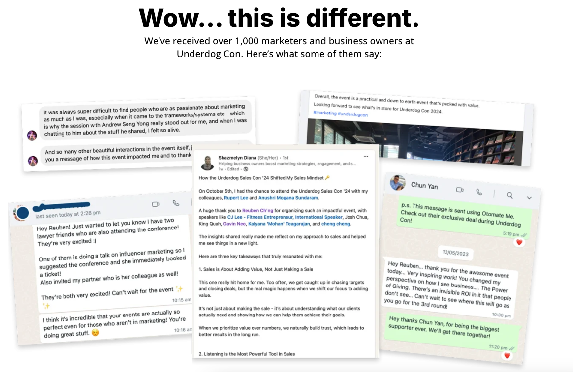 One of the very first things we do when designing the landing page for Underdog Con – is to put up screenshots of testimonials and words from past attendees.