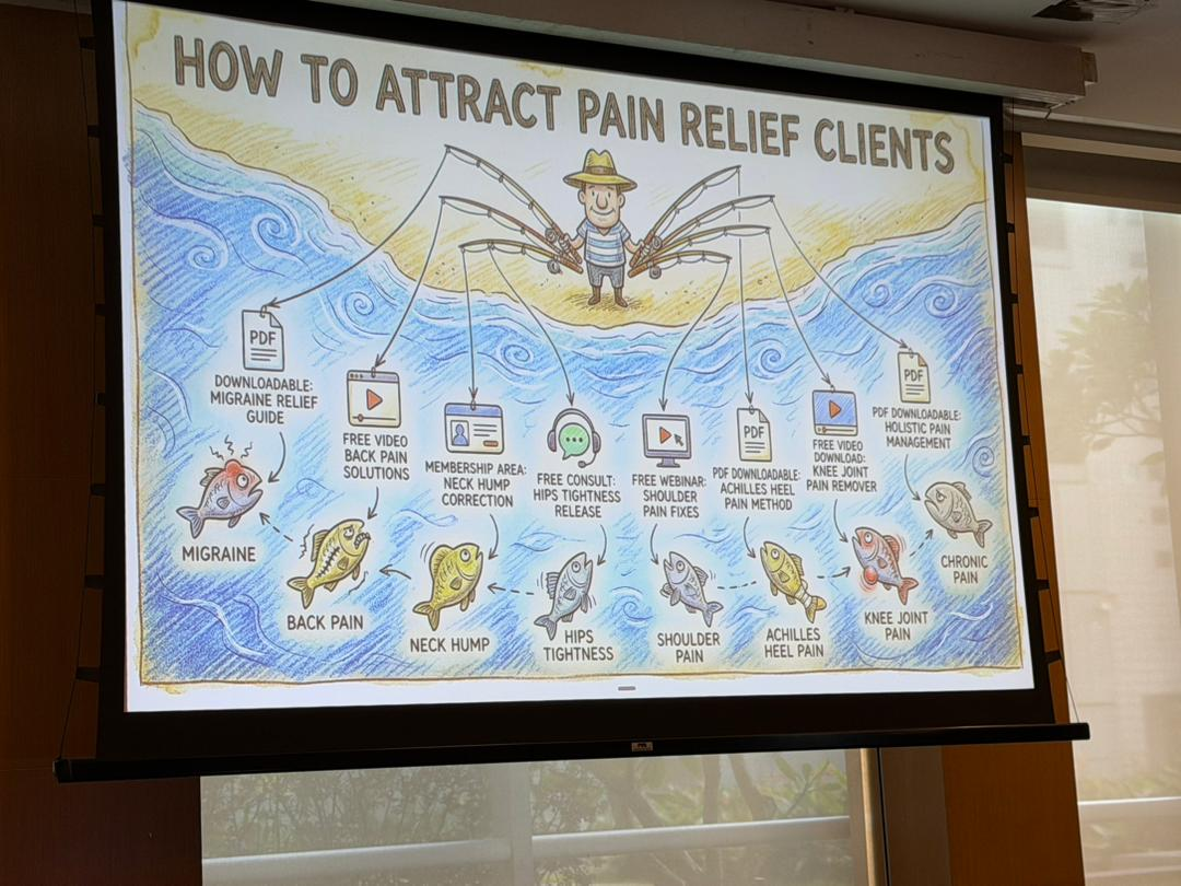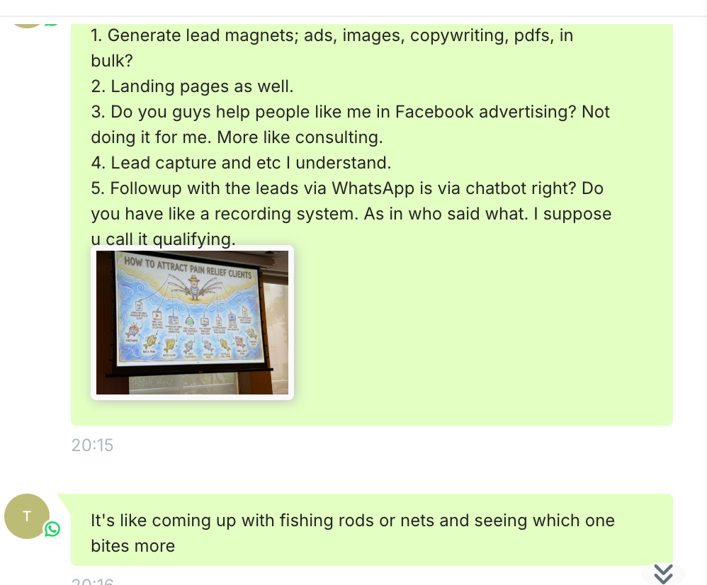 Ohh wow. So marketing is like fishing? And different "baits" to catch different fish. And he wanted to use AI to create all these lead magnets.