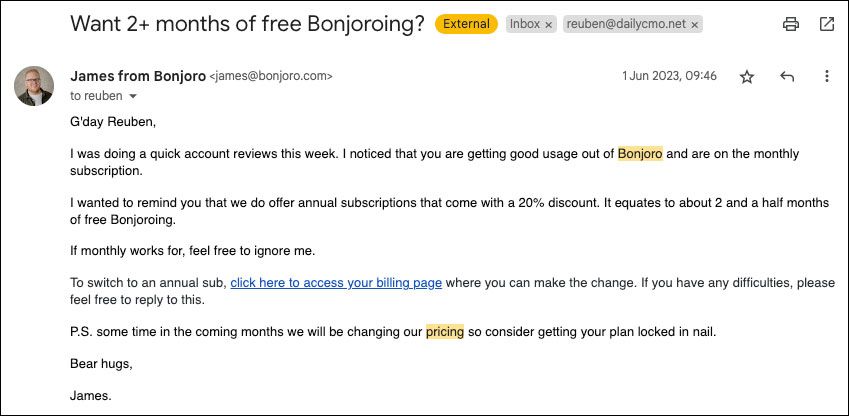 Turns out the marketing team at Bonjoro are also experts at loss aversion! From the example above, James is convincing me to convert to an annual subscription, with the premise I don't lose the current cheaper pricing plan.