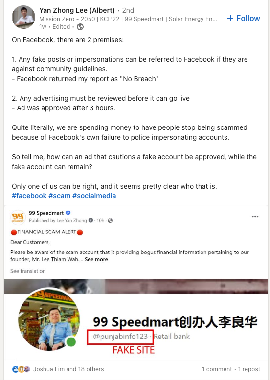 The team at 99 Speedmart is spending money to run ads – to caution people of fake impersonations acting as them. What an irony.