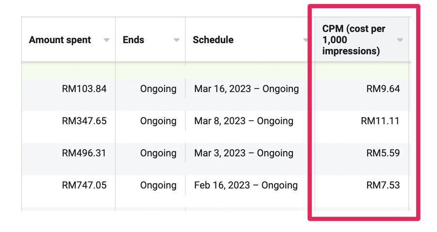 Here's an example: This ad campaign on Facebook (see below) cost us an average of RM8.40 per CPM.