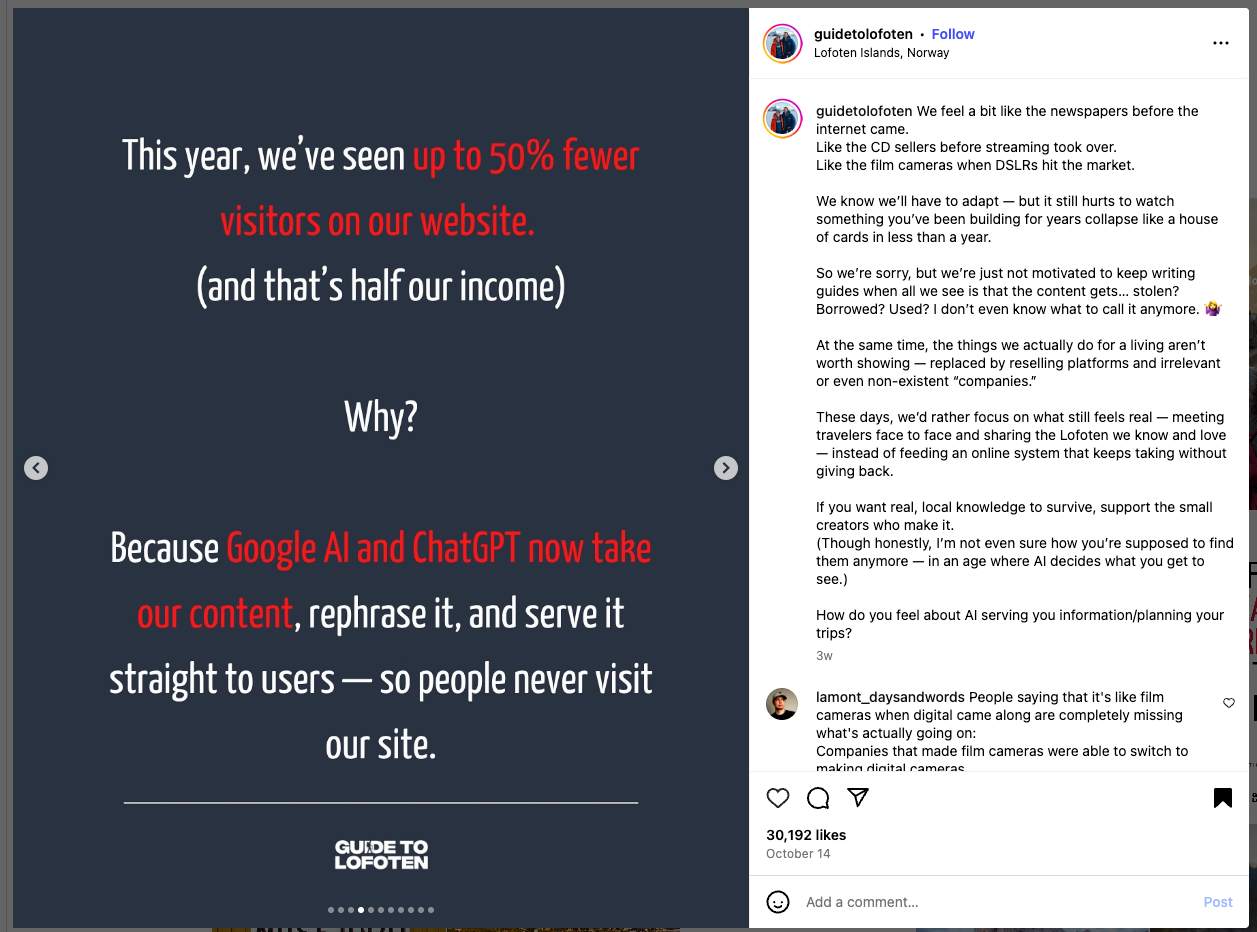 This year, a small hiking company in Norway that built their businesses on SEO – guides, blog posts, travel content lost 50% of their revenue.