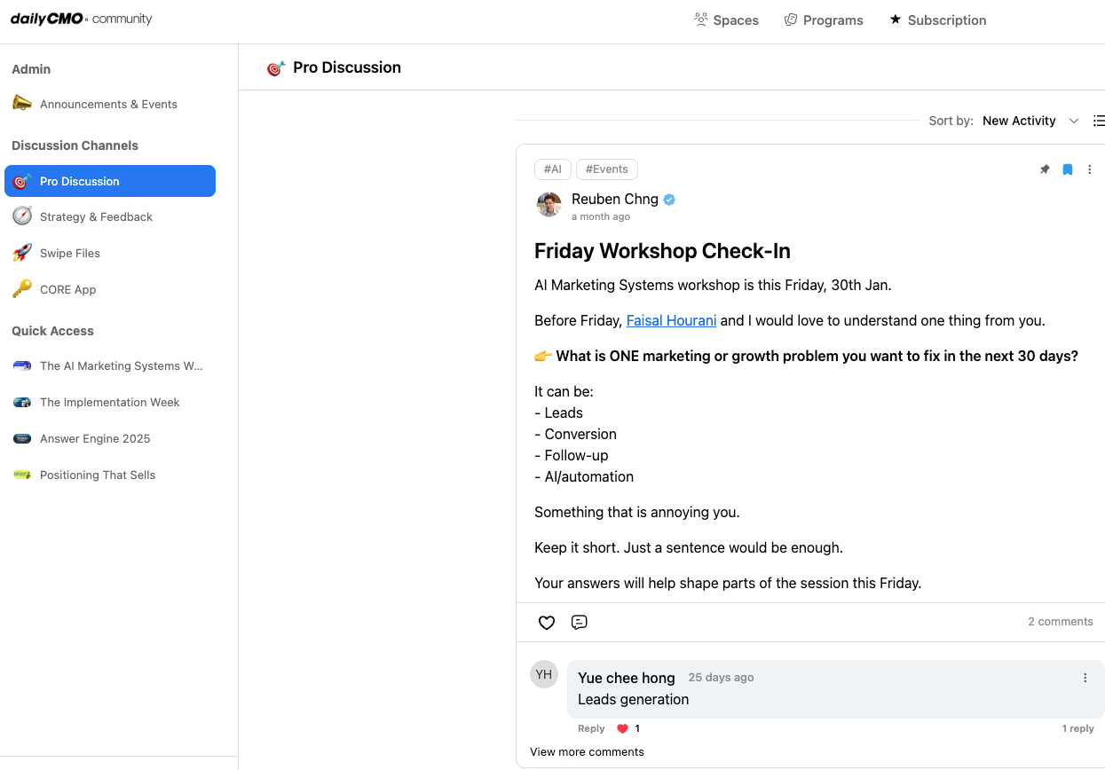 - Two workshop sessions (Tues & Wed) to build a lead gen system.