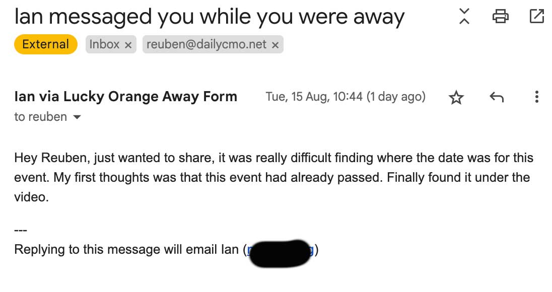 The next day, I received a message through the chat on the page: